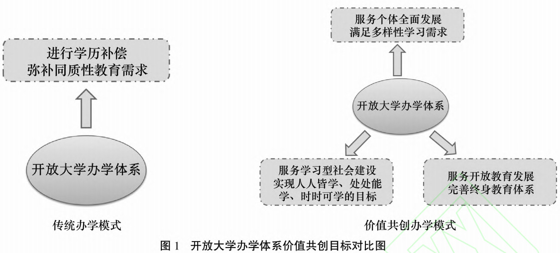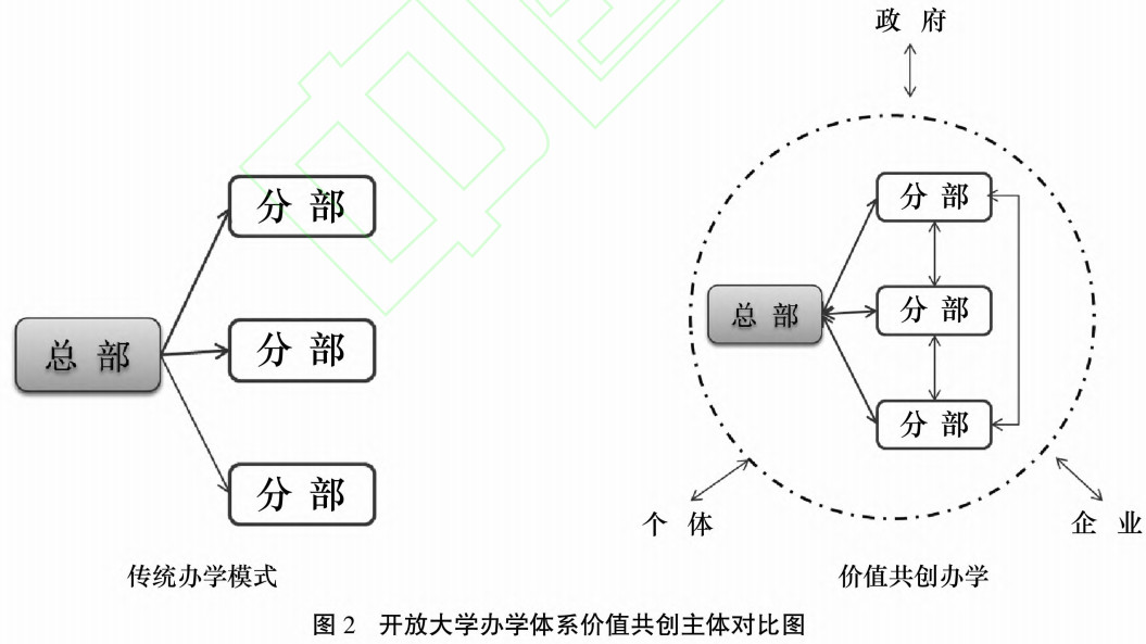 一、理念起点:价值共创之内涵 20世纪初,美国管理学家斯蒂芬L.瓦戈(StephenL.Vargo)和罗伯特F.鲁什(RobertF.Lusch)在传统商品主导逻辑(gooddominantlogic)的基础上提出价值共创(valuecocreation)的理念。传统的商品主导逻辑(gooddominantlogic)注重商品的交换价值(valueinexchange),认为企业和顾客在价值创造中独立扮演着不同的角色,企业创造价值并在价值链上线性传递给顾客,顾客是价值的使用者和消耗者。但是价值共创理论强调使用价值(valueinuse),认为生产者不再是单独的价值创造者,消费者也不再是纯粹的价值消耗者,而是与生产者互动的价值共创者(valuecocreator)。 随着价值共创理论的发展,价值共创研究拓展了多个理论视角,包括服务逻辑、服务科学和服务生态系统视角。当前,复杂性科学研究范式因注重现实环境中的多种交互因素,如社会力量的影响、价值创造双方在社会结构中的位置和角色等因素而被广为接受,已经成为价值共创研究的主要范式。复杂性科学研究范式在理念假设上,认为服务是交换的根本基础。在共创主体上,认为价值是由多个参与者共同创造的,强调以“参与者—参与者”为导向(actortoactor,A2A);在价值理解上,不仅包含交换价值和使用价值,还关注参与者的体验价值、环境系统所影响的情境价值、特定社会背景下的社会情境价值和各种形态下的文化情境价值;在共创要素上,强调资源整合、服务交换、互动和制度;在共创层次中,强调包括以企业和顾客为核心的微观层,组织、产业和品牌社群组合的中观层,广泛的社会结构和活动覆盖的宏观层。 研究发现,价值共创会产生价值增值,有助于企业有效降低成本、改善经营绩效、提高创新力、塑造品牌、密切与消费者的关系,也有助于消费者享受共创体验、增强自我效能感和提高满意度、增加心理所有权等,是共享双赢的一种策略。实践领域,小米、携程、优步、淘宝网等企业已经运用价值共创,搭建共建平台,实现价值增值。 二、现有基点:办学体系之特征 开放大学办学体系,是开放大学办学的独有特征,是开放大学办学目标指引下的、由相互联系的办学机构按照一定原则和结构而组成的组织体系。 各国的开放大学都建立了风格各异的办学体系,如创办最早的英国开放大学(UKOpenUniversity),其办学体系由总部地区中心和学习中心组成,实行的是纵向垂直领导,即地区中心和学习中心都是由总部直接派出的,教学院、系、研究所以及学习中心作为基层组织负责学校总部各项决策的实施。私立性质的美国凤凰城大学(UniversityofPhoenix),其办学体系由总部、网络培训中心、分校或学习中心组成,在各区租用校舍,成立学习中心,面向市场,机制灵活。英迪拉·甘地开放大学(IndiraGandhiNationalOpenUniversity)办学体系由总部、地区中心和学习中心组成,地区中心与州政府合作,并由总部授权自治。加拿大阿萨巴斯卡大学(AthabascaUniversity)办学体系由总部和学习中心组成,学习中心由大学总部直接派出人员,财务也由大学总部直接管控。 由于我国的开放大学是在广播电视大学基础上建立的,因此,我国的开放大学办学体系,也是在广播电视大学系统的基础上建立而成的。 具体而言,我国开放大学办学系统实行的是各级政府办学,教育行政部门管理的体制,在教学上实行“统筹规划、分级办学、分级管理”的模式,即在国家开放大学、省级开放大学、地级开放大学、县级开放大学的办学系统中,各级学校由政府主办,行政上接受当地教育部门主管,教学业务接受上级开放大学指导,同时具有科层制和二元交叉管理的特点。当前,开放大学办学体系建设依然需要依托电大系统,但是不能依赖电大系统,需要在原有的基础上探索改革。 由此可见,无论国外还是本土,其开放大学的办学体系普遍具有相似的特征,即都有总部和分部之分,其中总部负责各项决策的制定以及人员、经费等的管理,业务上指导或直接领导分部。分部自主权不高,学习者以及其他社会组织等作用的发挥也不甚明显。 三、问题焦点:理念引入之可能性和必要性 近年来,服务价值共创理论和模型被成功应用于电子商务、旅游业、工业生产等多个领域。从开放大学办学体系的属性以及当前面临问题两个方面来看,将价值共创理论应用于开放大学办学体系建设,具有必要性和可能性。 (一)开放大学办学体系自身属性决定其需要价值共创 2012年,我国3所开放大学率先成立,相关文件认为在广播电视大学基础上建设现代开放大学,是满足人民群众多样化学习需求、促进教育公平、克服应试教育弊端和落实素质育的重要途径,是构建终身教育体系、形成学习型社会的重要支撑,是教育服务国家发展、提高全民族素质的重要措施。开放大学的这一功能,在《教育部关于办好开放大学的意见》中有更具体的表述,进一步细化了开放大学的服务对象与服务内容,即“坚持面向基层、面向行业、面向社区、面向农村,广泛开展职工教育、社区教育、老年教育、新型农民教育和各类培训”。 可见,开放大学的服务对象是一切具有学习意愿的成人学习者,服务内容包含一切社会建设可能涉及的内容。完成对象如此广泛、内容如此多样的任务,必须依靠强大的办学系统。正如上海开放大学的调查数据显示,93%的学生来源于办学体系中的分校或分部,因此,办学必须要坚持共同的办学目标在不同区域与层级