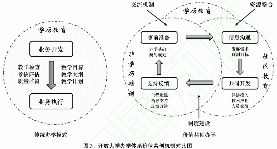(三)共创机制之突破:从单方决策到协商共策 传统的开放大学办学体系,缺乏共创的机制。从管理机制来说,国家开放大学是业务的创造者、指导者、决策者、监督者,集多重角色于一身;各分部是业务的执行者和被监督者,事业发展体现从总部到分部的单线关系,缺乏互动与反馈,总部掌握决策权,分部能动性受限。价值共创理念下,总部与分部打破单方决策的格局,形成协商共策关系。开放大学可在学历教育、非学历培训、社区教育等方面进行思考,在资源整合、交流机制、制度建设等重要方面进行共创,通过事前准备、信息沟通、共同开发、支持反馈等环节实现共创目标。 具体而言,事前准备主要指双方的规则约定、建立关系与办学基础,包括总部与分部双方认可的规则约定,建立在前期积累上的硬件、软件、政策支撑以及办学特色,这是价值共创的基础;信息沟通主要指社会需求与系统需求的沟通,指总部、分部、企业、政府在价值共创的各个阶段中,围绕目标而进行的个体学习需求、社会发展需求以及体系内部需求的信息沟通,这是价值共创的工具行为,也是共创过程中的心理认同度的升华;共同开发主要指总部和分部在知识、人员、财力等方面的共同投入,双方共同开发项目,邀请多方主体共同参与,利用各方的先进技术与平台,整合优质资源,创造新资源,并进行资源流动,增强参与各方的实力,这是区别于传统办学系统管理模式的关键环节;支持反馈,主要指价值共创的全程中,总部对分部的支持与反馈,包括总部参与项目的落实过程,对分部进行专业化指导,追踪了解困难与瓶颈问题,共同改进业务,提升业务价值的释放力度,这是价值共创的循环往复特征。广播电视大学两个发展阶段的机制关系比较可见图3。
