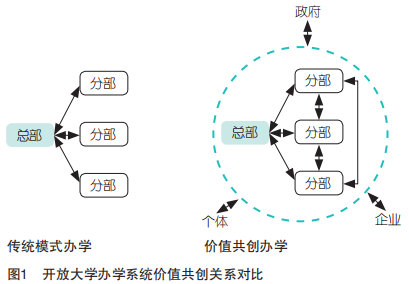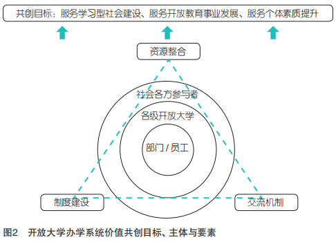 开放大学是以开放、灵活、全纳、终身、优质为核心理念,面向全社会成员,以现代信息技术为支撑,实行多模式办学和混合式学习、服务终身学习和学习型社会建设的新型高等学校[1]。2010年,《国家中长期教育改革和发展规划纲要(2010-2020年)》明确提出,要“办好开放大学”。2012年,我国在原有广播电视大学的基础上,先后成立了国家开放大学、北京开放大学、上海开放大学、江苏开放大学、云南开放大学、广东开放大学。2016年,教育部出台《教育部关于办好开放大学的意见》,进一步明确办好开放大学要求与措施,提出要“完善办学系统”。办学系统是开放大学的重要核心和实施远程教育规模化办学的重要保障,是开放教育生存的基础和实现健康可持续发展的重要保证[2]。在共享时代下,如何更好建设开放大学办学系统,仍是不断探讨的问题。 一、问题提出 系统指由相互联系的某些要素组成的具有特定功能的整体[3]。开放大学办学系统,指的是开放大学基于办学目标的实现,由相互联系的办学机构按照一定原则、结构而组成的组织体系[4],开放大学办学系统,因国情、文化、环境等因素而各具特色。如英国开放大学办学系统由总部地区中心和学习中心组成,实行的是纵向垂直领导,即地区中心和学习中心都是由总部直接派出,教学院、系、研究所以及学习中心作为基层组织负责学校总部各项决策的实施和运行[5]。美国凤凰城大学办学系统由总部、网络培训中心、分校或学习中心组成,在各区租用校舍,成立学习中心,面向市场,机制灵活[6]。迪拉·甘地开放大学办学系统由总部、地区中心和学习中心组成,地区中心与州政府合作,并由总部授权自治[7]。加拿大阿萨巴斯卡大学办学系统由总部和学习中心组成,学习中心由大学直接管理,人员、财务都由学校直接控制[8]。 我国开放大学的办学系统,是在广播电视大学系统的基础上建立而成,实行“统筹规划、分级办学、分级管理”的体制,即在国家开放大学、省级开放大学、地级开放大學、县级开放大学的办学系统中,各级学校由政府主办,行政上接受当地教育部门主管,教学业务接受上级开放大学指导,具有科层制和二元交叉管理的特点,是一种松散式的耦合结构。这种模式在“学历补偿”和“文化补习”时期,充分体现了科层制所带来的“稳定、严密、有效、精确”的优质,通过自上而下的资源供给,在短期内满足群体的同质性学习需求,保证了开放教育的办学规模和社会贡献率。但是,随着“学历补偿”时代的结束和高等教育大众化时代的到来,市民的教育需求越来越多样化,教育的选择也越来越多元化,开放大学办学系统遭遇了一些困境。首先,学生数量下降。由于现代远程教育学生来源不受任何国家计划的制约和行政权力的干预,是自主选择的行为,因此,学生数量也是不固定的,并且近几年呈现下滑趋势。英国开放大学自2010年起学生人数开始下降,韩国国立开放大学从2000年初报名人数和注册学生数减少,美国凤凰城大学因人数下降而削减财政投入,泰国苏可泰大学的学生数也逐年下降,我国的开放大学也不例外。其次,需求应对不足,专业更新的缓慢,与“互联网+”时代对接的不及时,难以实现对学习者的个性化服务,难以做到区域化发展的“量体裁衣”。第三,办学凝聚力下降。开放大学办学系统中出现了举办网络教育等其他形式的办学,缺乏品牌认同感和心理所有权等。 针对当前开放大学办学系统中存在的问题,价值共创理论在其观念共创、过程共创和价值共享等方面为开放大学走出困境提供新思路。 二、价值共创理念概述 价值共创(value co-creation)的思想最早可以追溯到20世纪初,主要存在于服务经济学的研究中,是在Lush和Vargo提出的服务主导逻辑(service dominant logic)的基础上提出的。传统的商品主导逻辑(good dominant logic)注重商品的交换价值(value-in-exchange),认为企业和顾客在价值创造中独立扮演着不同角色,企业创造价值并在价值链上线性传递给顾客,顾客是价值使用者和消耗者[9]。但是价值共创理论强调使用价值(value-in-use),认为生产者不再是单独的价值创造者,消费者也不再是纯粹的价值消耗者,而是与生产者互动的价值共创者(value co-creator)[10]。 以早期服务主导逻辑为基础,价值共创研究拓展了多个理论视角,包括服务逻辑、服务科学和服务生态系统视角。整体来看,顾客体验、服务主导逻辑(早期)、服务逻辑视角主要关注企业和顾客之间的二元关系,而服务科学和服务生态系统视角则关注多个参与者之间的网络关系[11]。目前,在复杂性科学研究的范式下,服务生态系统视角因其充分考虑现实环境中的多种交互因素,如社会力量的影响、价值创造双方在社会结构中的位置、角色等因素,而被广为接受[12]。服务生态系统以“参与者-参与者”为导向(actor to actor,A2A),一个由资源整合者通过共享的制度安排和服务交换的相互价值创造而连接的相对独立的、自我调节的系统[13],认为服务是交换的根本基础,价值是由多个参与者共同创造,一切社会和经济参与者都是资源整合者,价值共创通过参与者创造的制度和制度安排来协调[14]。服务生态系统强调资源整合、服务交换、互动和制度[15],认为价值共创在宏观、中观和微观三个层次中发生互动:微观层是个体的二元结构和活动,企业和顾客是核心;中观层是中