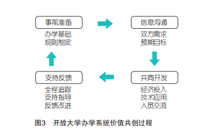 事前准备,主要指双方的规则约定、建立关系与办学基础。在一个相对自由与松散的组织中进行共同创造活动,需要构建各成员都认可的规则[35]。因此,签署办学协议,了解双方权责是价值共创的首要条件。事前准备还包括良好的办学基础,分部的办学特色、企业的资源积累、政府的政策支撑等,因为系统办学中的共创主要集中在专业、课程、项目等业务内容,要创造更高的价值,需建立在双方已有的办学基础之上。 信息沟通,主要指社会需求与系统需求的信息沟通。开放大学在服务学习型社会的过程中,与普通高校不同的是,对社会需求的发觉更敏锐,专业、课程等设置更加个性化,面临着不确定性。因此,总部、分部、企业、政府的信息沟通,是精准服务当地区域发展的必然环节。办学组织现有的资源、政府或企业的需求等,都需要在沟通中实现信息对称。有效沟通,需要建立一定的沟通机制,前期信息交换、中期阶段进展等,都需要通过顺畅的沟通流程、正式的会议调研或非正式的座谈交流等形式实现沟通。此外,信息沟通不仅仅是一种工具行为,交流互动本身产生的情感体验也应该得到重视[36]。情感上的认同能够激发更大的管理效力和创造潜力。 共同开发,主要是知识、人员、财力等方面的共同投入。这是区别于传统的办学系统管理模式的关键环节,破除了总部拥有开发权,分部、企业等持有使用权的模式,让分部、企业、政府与总部共同成为开发者。在开发过程中,开发者共同投入人员、技术和资源。对于总部发起的项目,邀请分部、企业和政府人员共同参与,利用参与各方的先进技术与平台,整合优质资源,创造新资源,并进行资源流动,推动参与各方的实力。共同開发的业务,不仅能够实现资源优势,还能够提高参与方的心理归属感。 支持反馈,主要指价值共创的全程中,总部对分部的支持与反馈。这里强调的全过程和“对称性”角色,即双方的共创不仅发生在产品开发阶段,同时也要发生在产品消费阶段,顾客不仅要参与企业的创造,企业也要参与顾客的产品使用[37]。总部要参与到分部业务开展的过程中,追踪了解落实情况,获取分部的反馈,对分部进行专业化指导,共同改进业务,提升业务价值的释放力度。共创的过程不是一蹴而就的,而是经历过不断的循环和重复逐渐提高开放大学的服务价值,使得学员的满意度和开放大学的社会服务功能最大化。 | |||